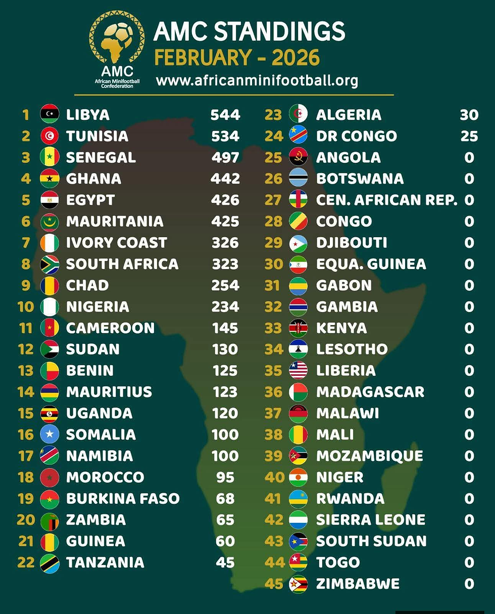 Le Sénégal a gagné deux places au dernier classement de la Confédération africaine de mini-football (AMC) dont il occupe désormais la troisième position.Cette progression fait suite à l’organisation par le pays de la première édition du tournoi national de mini-football, tenue du 1er au 15 décembre 2025.
